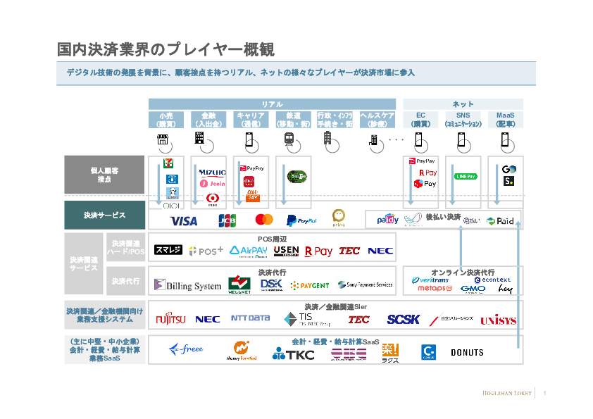 - デジタル技術の発展を背景に、顧客接点を持つリアル、ネットの様々なプレイヤーが決済市場に参入している