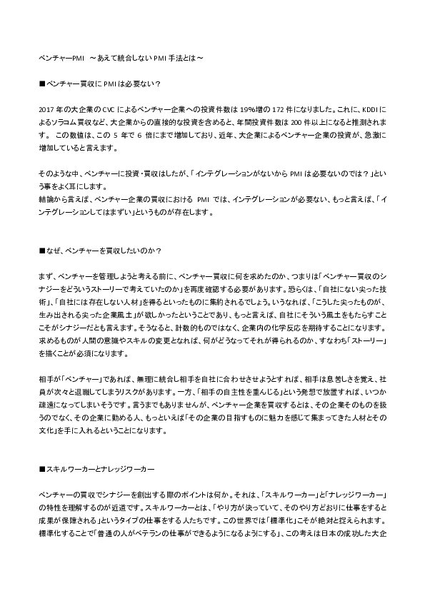 Home インサイト M&Aナレッジ ベンチャーPMI あえて統合しないPMI手法とは|こちらシナジー最前線 Vol.13 Home インサイト ベンチャーPMI あえて統合しないPMI手法とは|こちらシナジー最前線 Vol.13 M&Aナレッジ 2018.07.31 PDFのレポートをご確認ください。文字が見えにくい場合、表示を拡大、またはPDFをダウンロードしてご参照ください。 資料のダウンロード 続きを見る