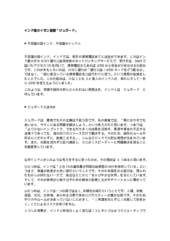 Home インサイト M&Aナレッジ インド版カイゼン思想「ジュガード」|こちらマーケット最前線 Vol.9 Home インサイト インド版カイゼン思想「ジュガード」|こちらマーケット最前線 Vol.9 M&Aナレッジ 2018.06.30 PDFのレポートをご確認ください。文字が見えにくい場合、表示を拡大、またはPDFをダウンロードしてご参照ください。 資料のダウンロード 続きを見る
